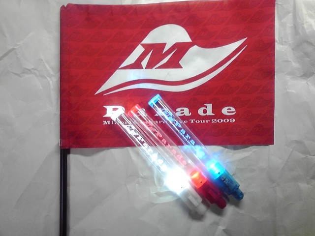 画像は物販で買ったペンライトと、「Lush march!!」で使ったフラッグ。